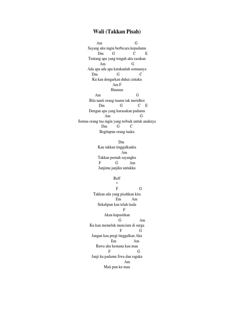Semua orang tua ingin yang terbaik untuk anaknya. Kunci Gitar WALI - Takkan Pisah Chord Dasar. Sayang aku ingi berbicara kepadamu tentang Apa yang telah aku rasakan Ada apa ada apa katakanlah semuanya Ku kan dengarkan duhai cintaku.